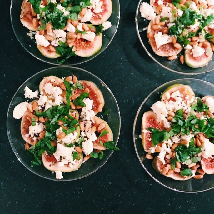 Snijd de vijgen in dunne plakjes en schik ze op een bord. Verkruimel de feta met je handen over de vijgen en strooi er de geroosterde pijnboompitten over. Kruid enkel met zwarte peper en wat verse kruiden zoals basilicum (zeker geen zout!). Geniet er flink wat goede (extra vierge) olijfolie over.
