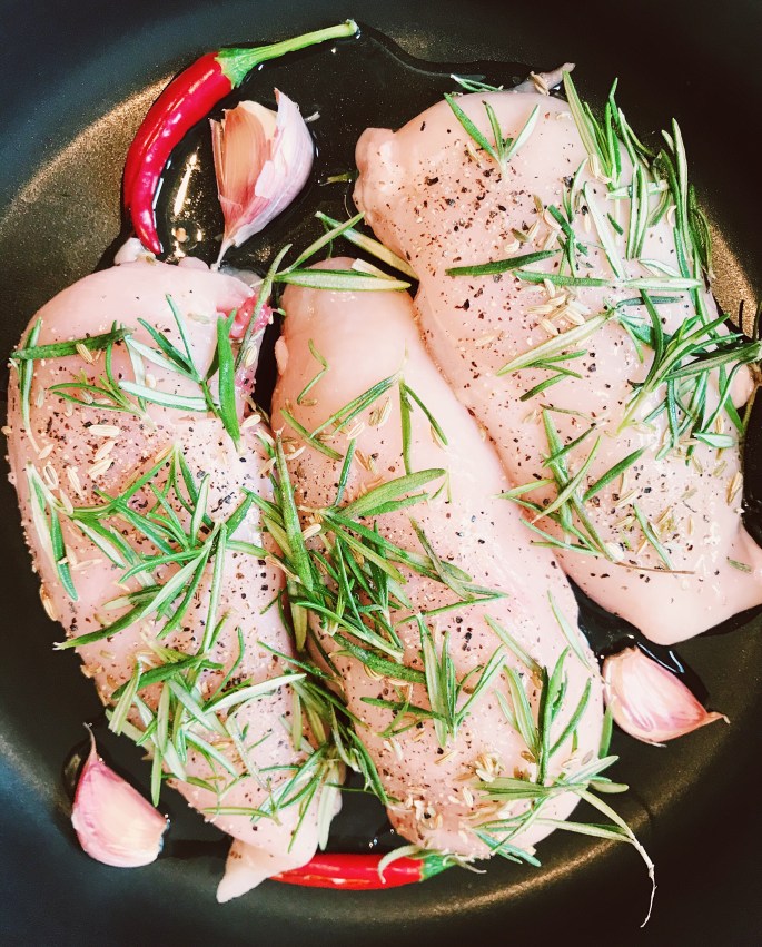 Kruid de kipfilets met peper, zout, venkelzaad en de naaldjes rozemarijn. Leg ze met de koolzaadolie, de ongepelde, geplette tenen knoflook en de in de lengte gehalveerde spaanse pepers in de pan. Keer ze na 3 tot 4 minuten om en bak ze goudbruin en gaar. Snijd de steeltjes van de boontjes en doe ze in een ruime kookpot (straks wordt hier ook de pasta en spinazie bij gevoegd), giet er voldoende kokend water (van de waterkoker) bij om ze onder te zetten en laat ze 6 minuten met deksel koken.