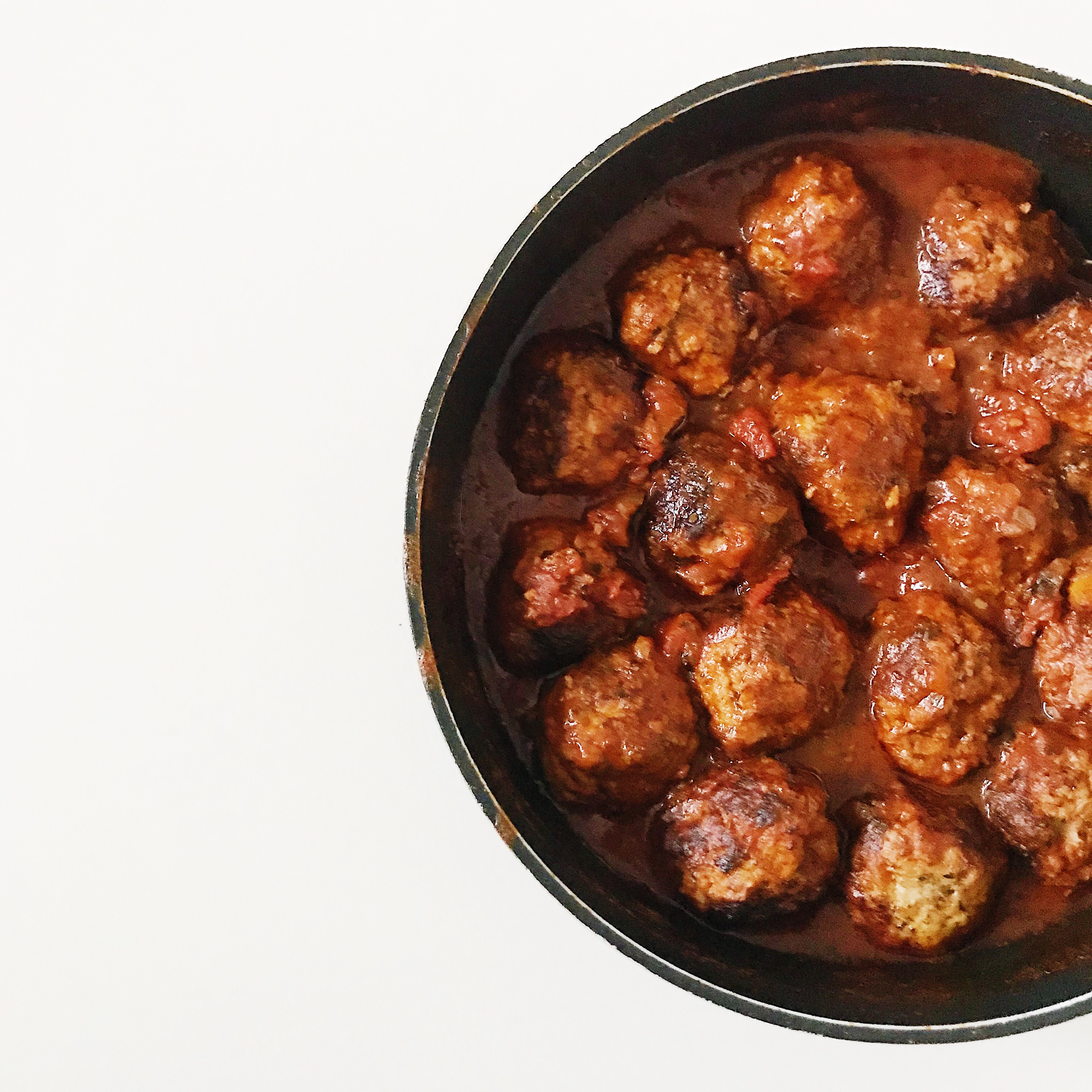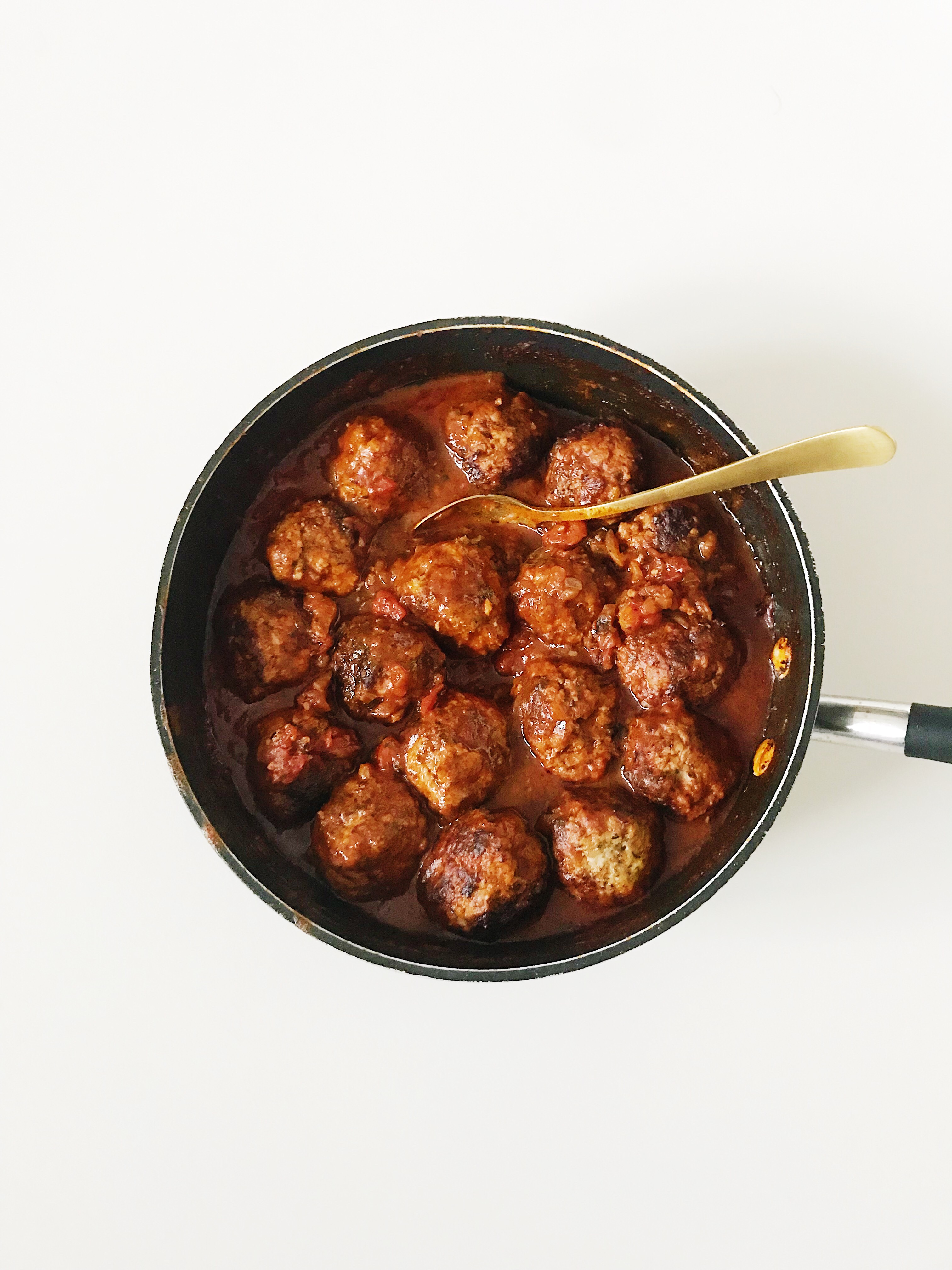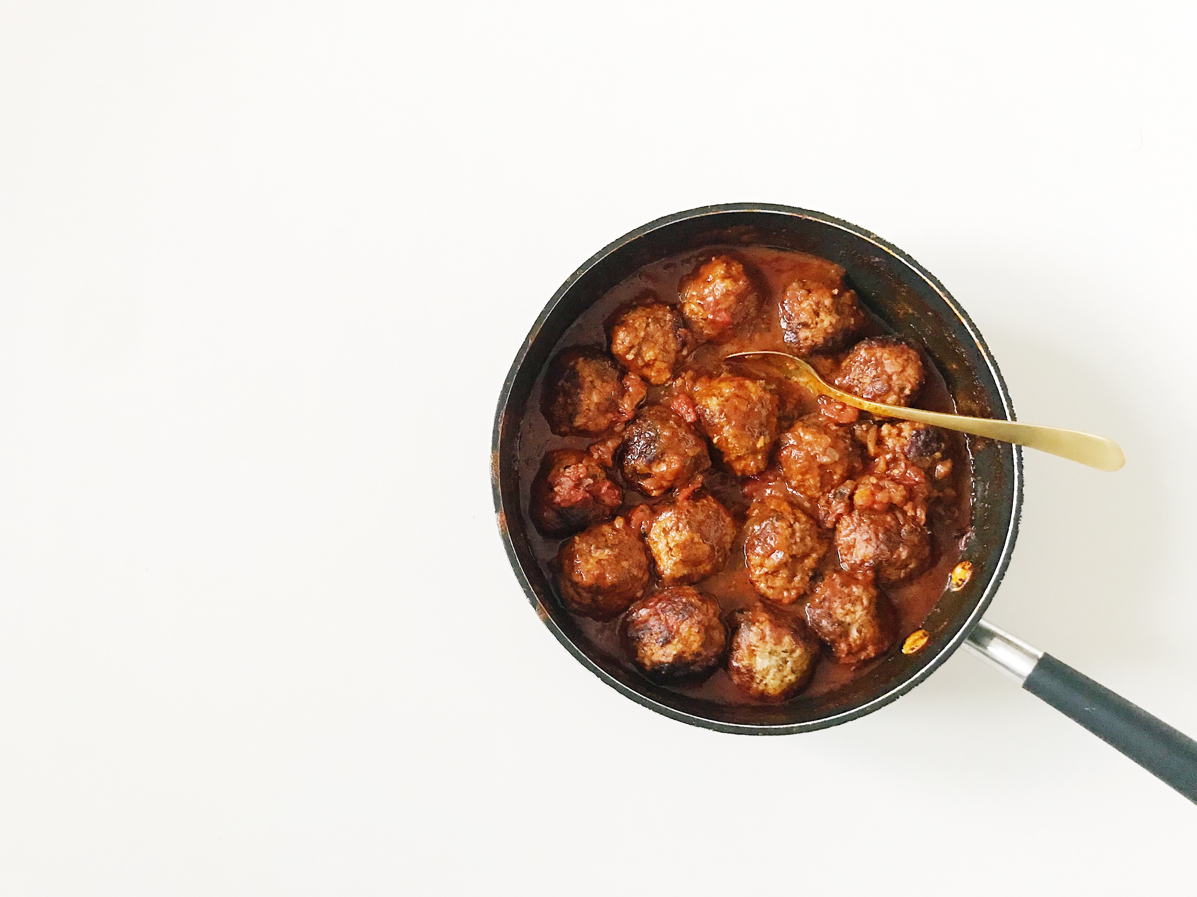 Giet 1 eetlepel olijfolie in een grote pan en leg, als hij heet is, de gehaktballen in de pan (als je teveel ballen hebt, doe je dit in 2 keer en voeg je bij de volgende portie weer 1 eetlepel olie toe). Bak de ballen rondom in 8 minuten aan en keer ze regelmatig (opgelet: de ballen bakken echt heel snel, dus hou ze goed in het oog). Leg ze daarna even op een groot bord.