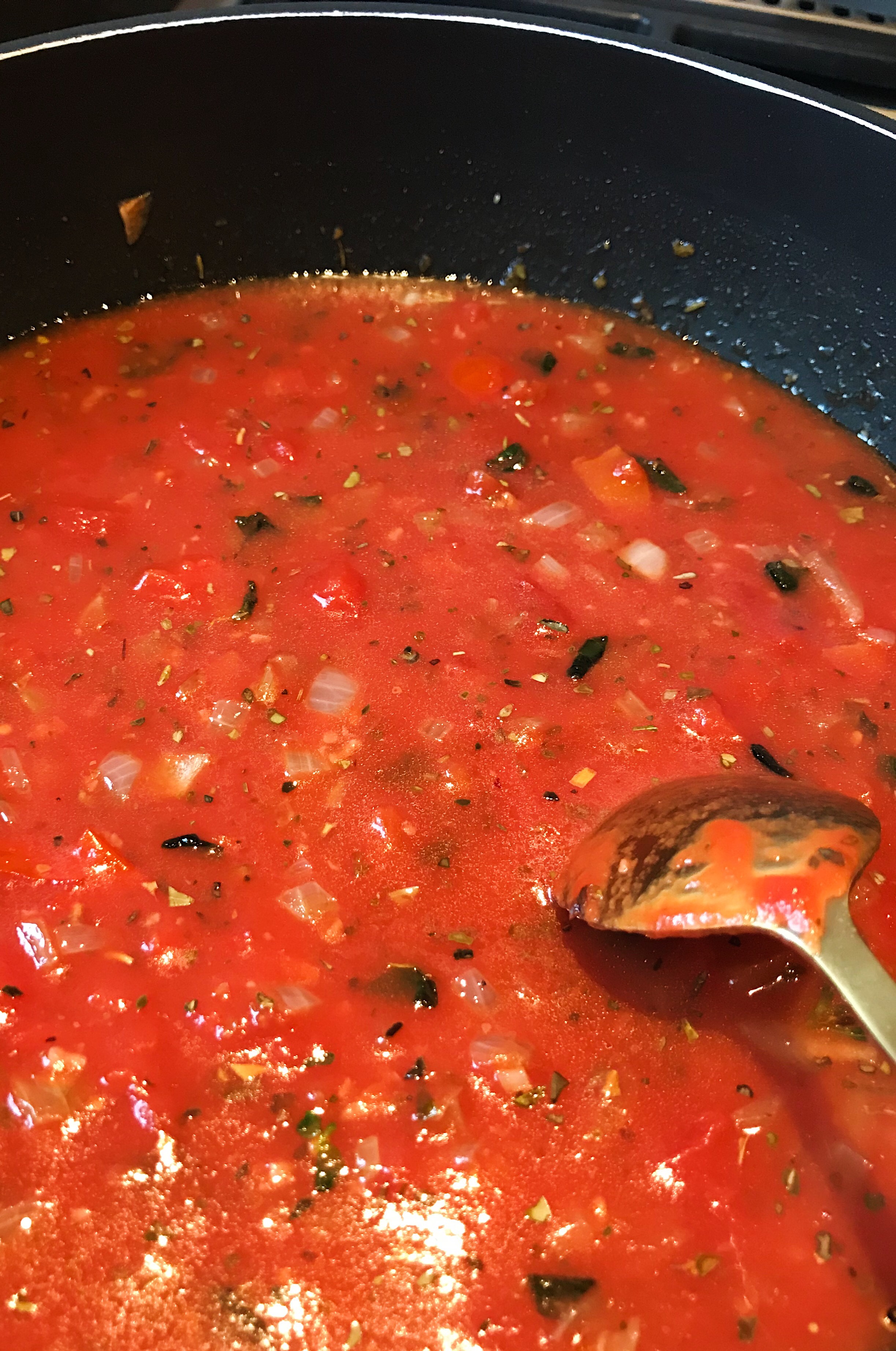 Begin met de tomatensaus. Giet 2 eetlepels olijfolie in een diepe pan en zet hem op halfhoog tot hoog vuur. Voeg de helft van de ui, de helft van de knoflook en de helft van de oregano toe en laat alles al roerend 8-10 minuten smoren tot de ui glazig is. Doe er tomaten, de helft van de bouillon, 1/2 theelepel zout en wat zwarte peper bij. Verlaag de temperatuur tot halfhoog en laat de saus af en toe roerend 10-15 minuten pruttelen tot hij ingekookt is.