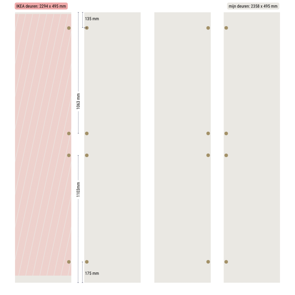 In deze stap wordt een overzicht gegeven van enerzijds de bestaande afmetingen voor de scharnieren van deuren met exact dezelfde afmetingen als die van IKEA PAX (voor basiselementen van 236 cm hoog), en anderzijds de aangepaste afmetingen voor de scharnieren/kastdeuren die ik op maat van mijn ruimte ga maken, zodat ze passen op de bestaande basiselementen van IKEA PAX van 236 cm hoog. Als je zelf aan de slag gaat kan je aan de hand van onderstaande info zelf kastdeuren op maat maken voor je IKEA PAX kasten.