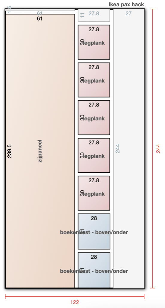 Ik wil dat de voorkant van de boekenkast gelijk komt met de deuren van de kleerkast. De kleerkast is 58 cm diep + 1,8 cm deur. De voorkant van de boekenkast moet dus op 59,8 cm van de plint komen – en de achterkant vanzelfsprekend op 27 cm (59,8 – 31 diepte boekenkast – 1,8 dikte achterkant boekenkast = 27 cm).