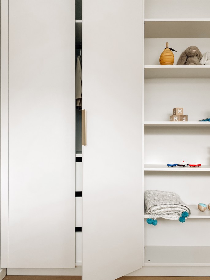 We maakten een ingebouwde kast met basiselementen van IKEA PAX en maakten zelf de kamerhoge kastdeuren, boekenkast en verdere afwerking in MDF. We gaven minder dan โฌ750 euro uit voor dit projectje.